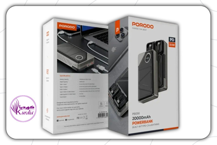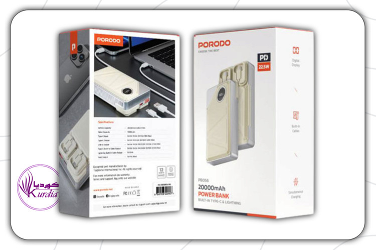 کابل های داخلی Type-C و لایتنینگ پاوربانک قابل حمل 20000 میلی آمپر ساعتی Porodo یک همراه قابل اعتماد برای شارژ چندین دستگاه است. با ظرفیت 20000 میلی آمپر ساعت، ظرفیت نامی قابل قبولی 11000 میلی آمپر ساعتی را ارائه می دهد و به شما اطمینان می دهد که برای مدت طولانی در حال حرکت هستید. دارای خروجی های Type-C و USB-A شارژ سریع است که برای بارگذاری عالی تا 22.5 وات پشتیبانی می کند. این محصول دارای کابل های Type-C و Lightning داخلی برای راحتی است. نیازی به حمل کابل های اضافه شده دائمی نیست. این پاوربانک با نمایشگر دیجیتالی برای نظارت فوری برق و شارژ همزمان، برای انجام چند کار در خانه یا محل کار ضروری است. دارای ورودی ها و خروجی های همه کاره است، از جمله ورودی 18 وات نوع C و خروجی 22.5 وات، که تطبیق پذیری را ارائه می دهد که آن را با بسیاری از دستگاه ها بسیار سازگار می کند - نجات عالی در سفر و زندگی روزمره شما.