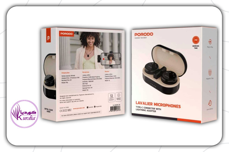 میکروفون یقه ای پرودو مدل lavalier دارای دو فرستنده همراه با یک بالشتک عرضه میشود که برای بهبود کیفیت برداشت صدا میتوانید از آن استفاده کنید و کاهش نویزهای غیرمنتظره از آن استفاده کنید. روی کیس شارژ نیز یک صفحه نمایشگر LED قرار گرفته است.