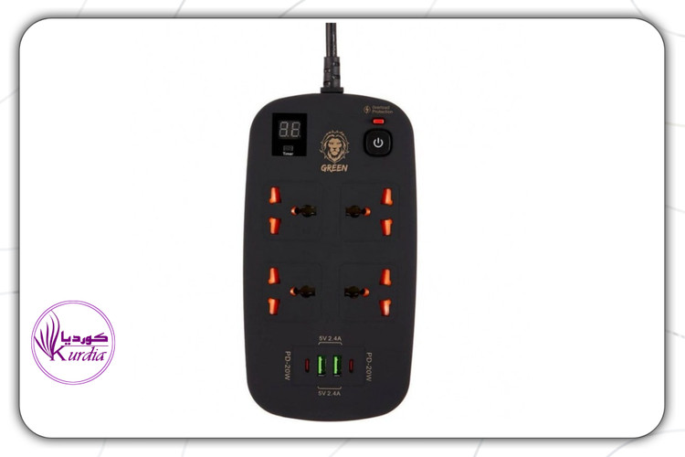 چندراهی برق گرین مدل GNPS2PD دارای 4 خروجی برق متناوب با امکان استفاده از انواع دوشاخههای ایرانی و اروپایی است.