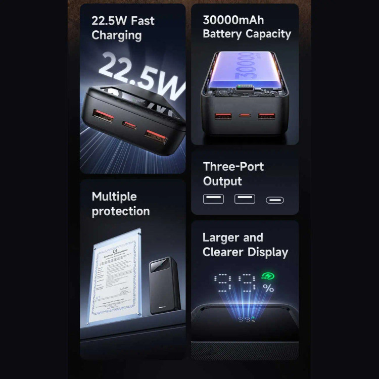 این پاوربانک 30000 زیبا دارای یک پورت تایپ c که به عنوان ورودی و خروجی استفاده میشود و دو خروجی USB است.